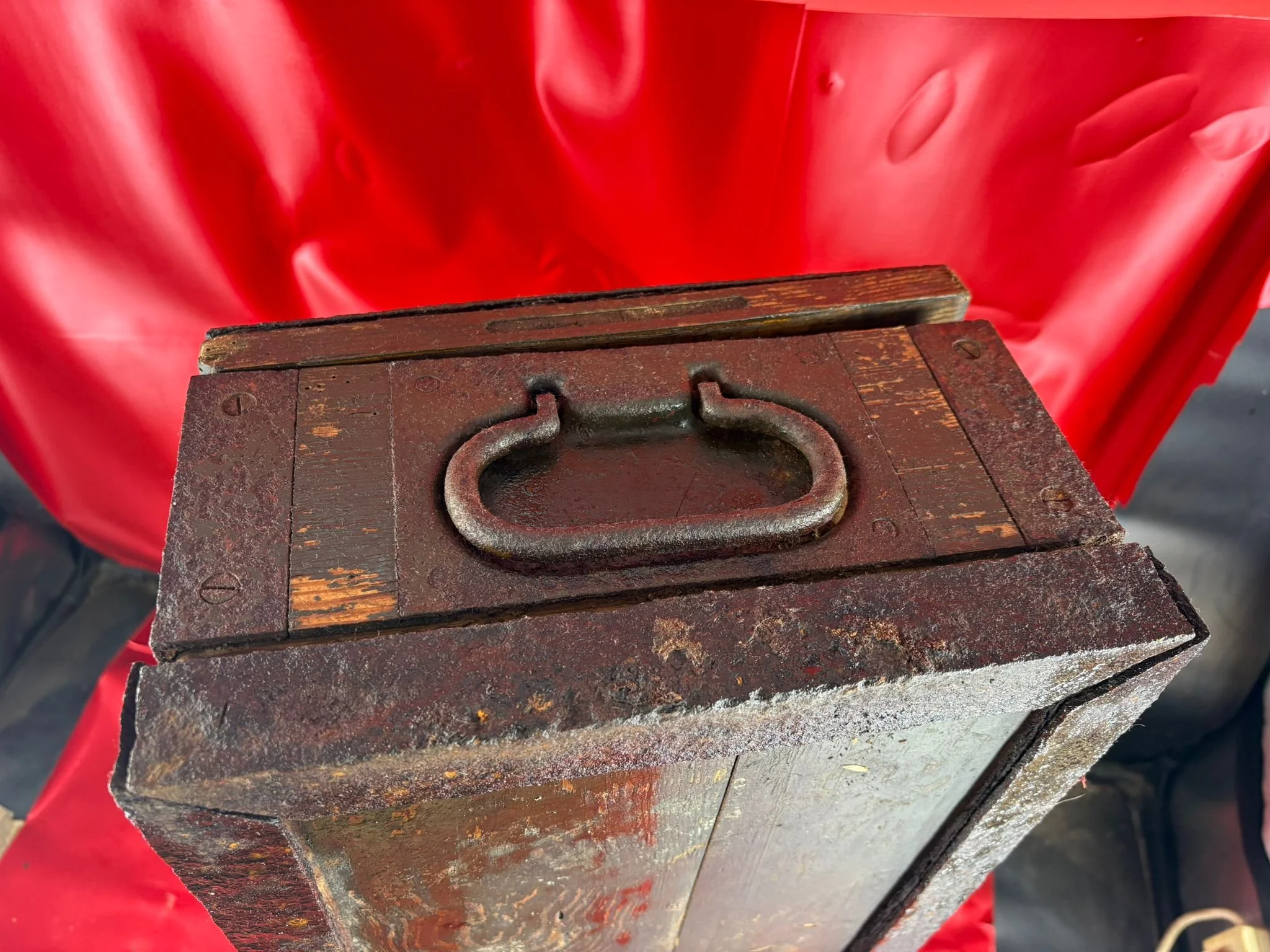 This is a German Wehrmacht blacksmith toolbox used by farriers in the 14th Panzer Division. The crate is in nice condition not perfect the wood still retaining most of its original green paintwork and some of its white stamped markings that can be partly seen.The box has metal support structure bars all over it which are rusty but solid, the box shows some dirt, discoloration, and light damage and is 29 inches long by 11 inches wide. The crate remains solid, not breaking up or falling apart. It has experienced some small amount woodworm, but this has been treated, and the box is fairly well preserved. Both hinges are intact and in good condition but a bit stiff; the locks have rusted solid might free up with more cleaning though the lid opens and closes without issue. The metal carry handles are also present but rusted solid. Inside, there are a lot of knocks and marks from use, it has been a well used crate. This is a nice example of this unusual crate that would have been used by the 14th Panzer Division as it was found in the town of Kalach in the area they captured in the battle of July-August 1942 on the Stalingrad front in Russia.The crate comes with 2x A5 laminated information cards.