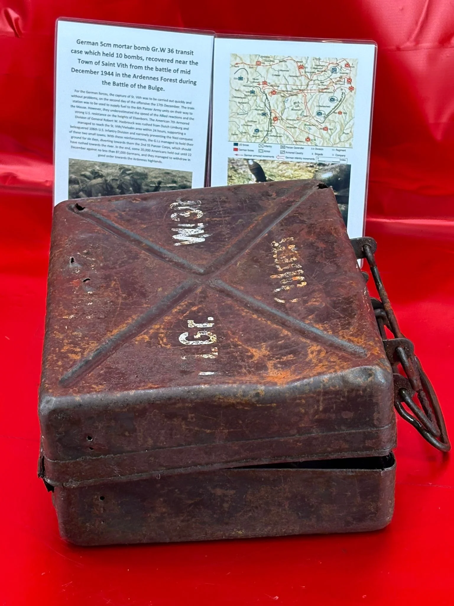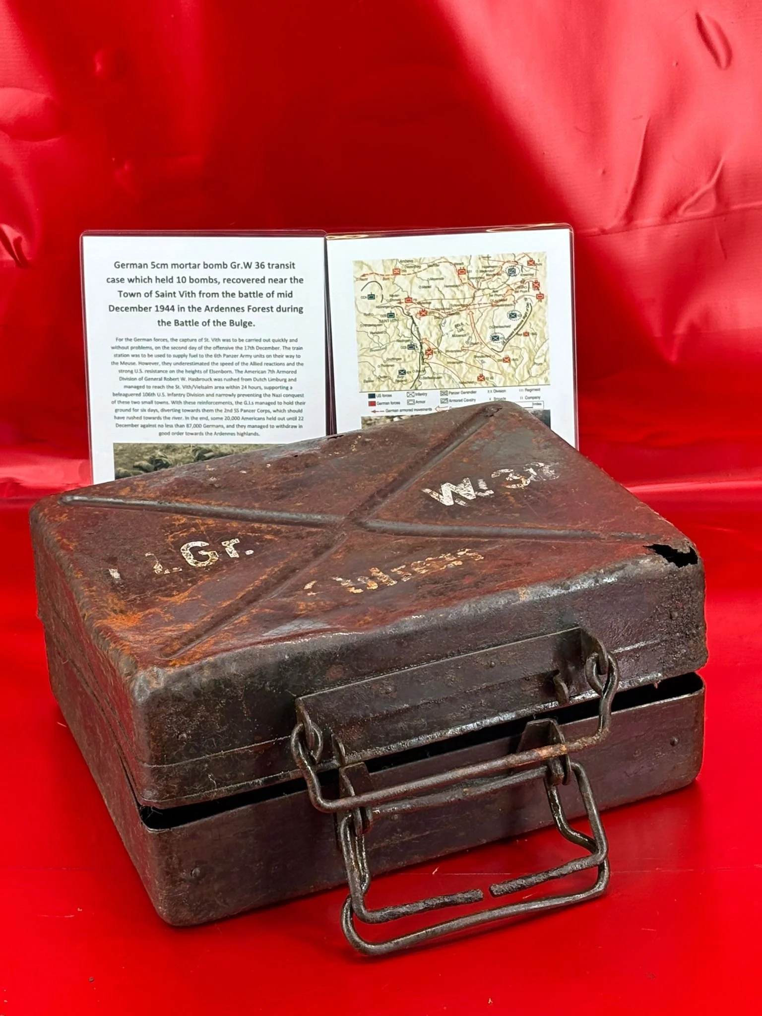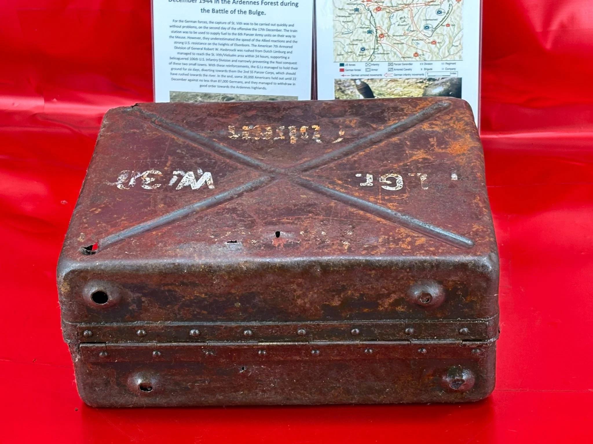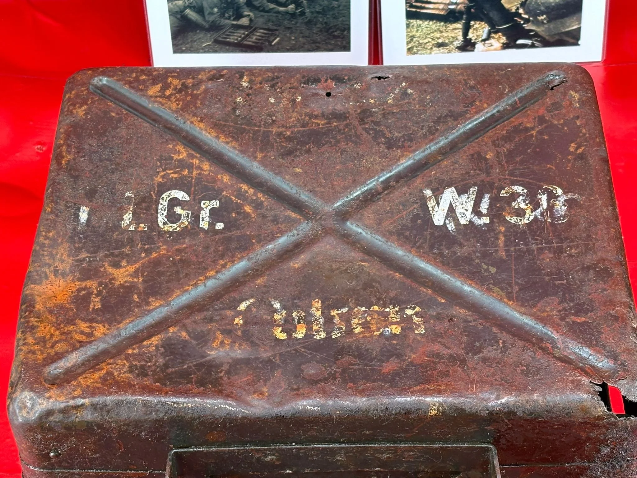 Categories: All WW2 Helmets, Badges, Belt Buckles, Medals, & Insignia WW2 Axis Aircraft Parts & Relics WW2 Allied Aircraft Parts & Relics WW2 Tank & Armoured Vehicle Parts Western Front WW2 Tank & Armoured Vehicle Parts Eastern Front WW2 Hand-Rifle Grenades, Mortar Bombs, Mines, Rockets WW2 Wooden & Metal Ammunition Crates, Boxes, & Tubes WW2 Artillery Shells, Fuses, Cases, & Projectiles WW2 Battlefield Relics West Front, Africa 1939-1943 WW2 Battlefield Relics Western Front 1944-1945 WW2 Battlefield Relics Eastern Front 1939-1945 WW1 Steel Helmets, Bayonets, Grenades, & Mortars WW2 Kriegsmarine Naval Relics, & Pacific Relics WW1 & WW2 Uniform Paperwork Pictures WW1 Allied British & French Relics WW1 Axis German & Austro Hungarian Relics WW1 Artillery Shells, Fuses, & Ammunition Crates & Boxes Gift Voucher All / WW2 Wooden & Metal Ammunition Crates, Boxes, & Tubes Russian 120mm mortar bomb tail section dated 1944 fired by the Russian 1st Guards Tank Army and recovered near the village of Sachsendorf on the Seelow Heights, 16-17 April 1945 £25.00 Only 1 available Russian maxim machine gun ammunition tin sed by soldiers of the 69th Army and recovered near the River Oder at Lebus, south of the Seelow Heights April 1945. £30.00 Only 1 available German complete 4 shell metal transport container dated 1941,maker marked for 5cm pak 38 gun recovered in 2022 from an old German ammunition bunker site in Narva 1944 battle. £40.00 Only 1 available German Army engineers carry case, maker marked dated 1936 recovered from the Kursk battlefield of 1943 £35.00 Only 1 available Battle damaged half a German 3.7cm flak shell carry case used by the 3.7cm flak anti-aircraft gun recovered from lake near Bastogne, Battle of the Bulge 1944 £30.00 Only 1 available Half a German 3.7cm flak shell carry case which has complete internal racking used by the 12th SS Panzer Division recovered 2007 from Krinkelt in the Ardennes Forest 1944 £25.00 Only 1 available German Naval 88mm flak gun shell container recovered from Kriegsmarine costal artillery position on the Atlantic wall at Saint Malo in France £30.00 Only 1 available German metal transport container for 76.2mm anti tank gun shell with rare 1942 pattern Dunkelgelb paintwork from SS ammunition store in Narva £35.00 Only 1 available Very rare German tellermine 42 anti-tank mine carry case lid, battle damaged solid relic condition recovered from near village of Trun in the Falaise Pocket, Normandy 1944 £28.00 Only 1 available German civilian made small medical box re used by the Wehrmacht recovered from the village of Bras near Bastogne from the Ardennes forest 1944-1945 £45.00 Only 1 available Nice condition German 12cm mortar charge container complete recovered near the village of Marinovka, an area defended by the German 297th Infantry Division at Stalingrad. £28.00 Only 1 available Russian maxim machine gun ammunition tin relic condition used by soldiers of the 69th Army and recovered near the River Oder at Lebus, Seelow Heights 1945. £38.00 Only 1 available Complete German 3.7cm flak shell carry case which has most of its internal racking used by the 12th SS Panzer Division and recovered in 2007 from the woods at Krinkelt in the Ardennes Forest £50.00 Only 1 available Fantastic condition semi-relic German 5cm mortar bomb Gr.W 36 transit case which recovered many years ago near the Town of Saint Vith in the Ardennes forest £75.00 Only 1 available German wooden carry crate for 2 x shell cases for 15cm SIG 33 heavy infantry gun, black ink markings recovered at Helmond in the Netherlands £38.00 Only 1 available American wooden ammunition crate for 81mm mortar rounds found in 1997 in the village of Le Gleize, Ardennes forest 1944 £40.00 Only 1 available German ammunition crate that held 1 case and 2 extra charges for 15cm Kanone with paper labels last packed 1942 recovered in the Demyansk Pocket in Russia 1941-1942 £35.00 Only 1 available Czechoslovakian wooden ammunition crate used by the German Army fired by VZ/1419 field gun it carried 3 rounds of ammunition found in Dieppe used in Normandy 1944 £165.00 Only 1 available German airtight wooden ammunition crate a Luftdichter patronenkasten taken from abandoned German vehicles in the village of Mont, just north of Houffalize. in the Ardennes Forest 1944-1945 £58.00 Only 1 available Rare to find German cardboard 15cm Nabelwerfer rocket round transport canister remains recovered from the battlefield at the Seelow Heights in 1945 £30.00 Only 1 available German Wehrmacht large food rations crate with eagle originally used by the 26th Volksgrenadier Division and was recovered from the village of Bras, near Bastogne, Ardennes Forest 1944-1945 £65.00 Only 1 available