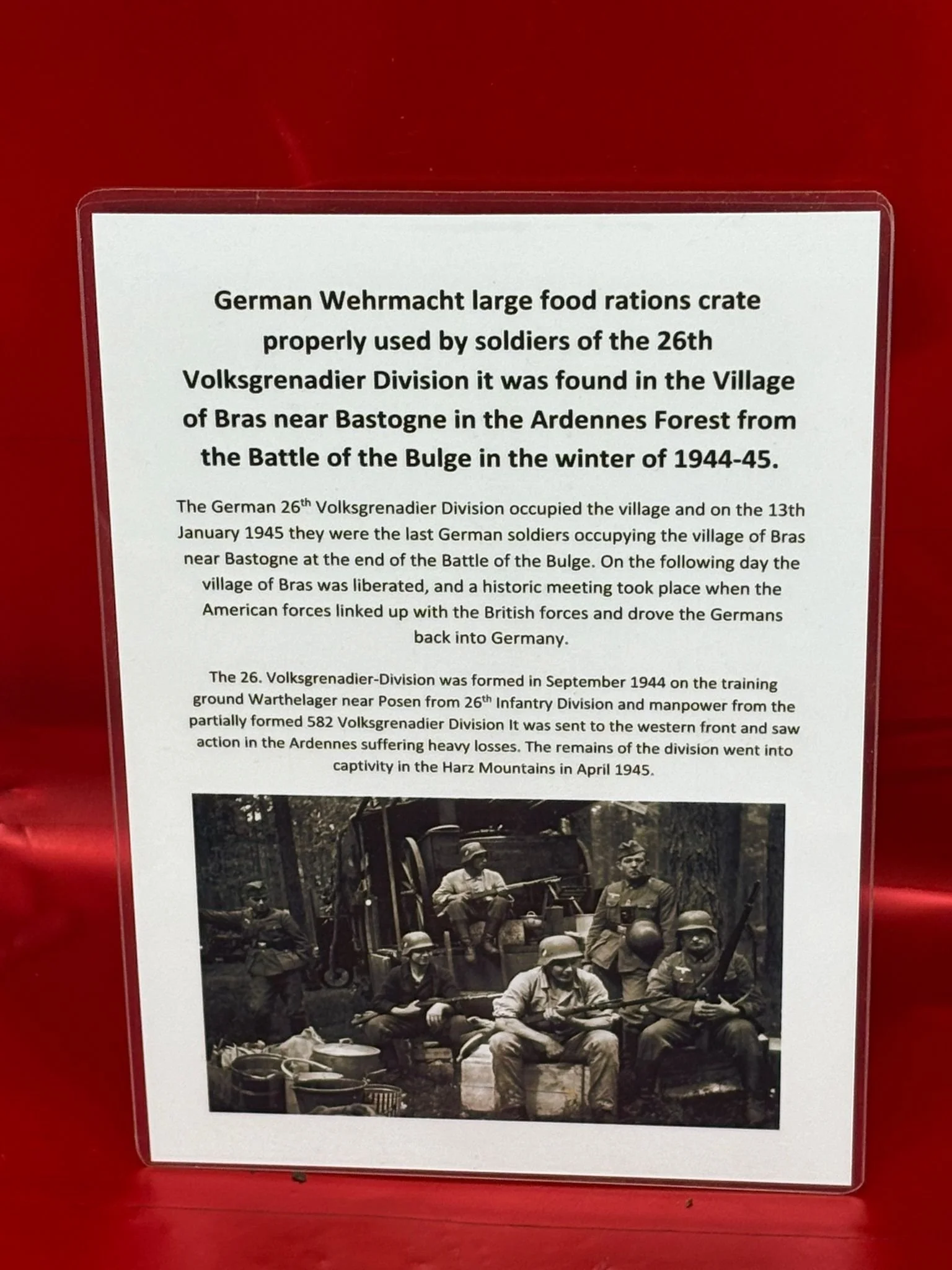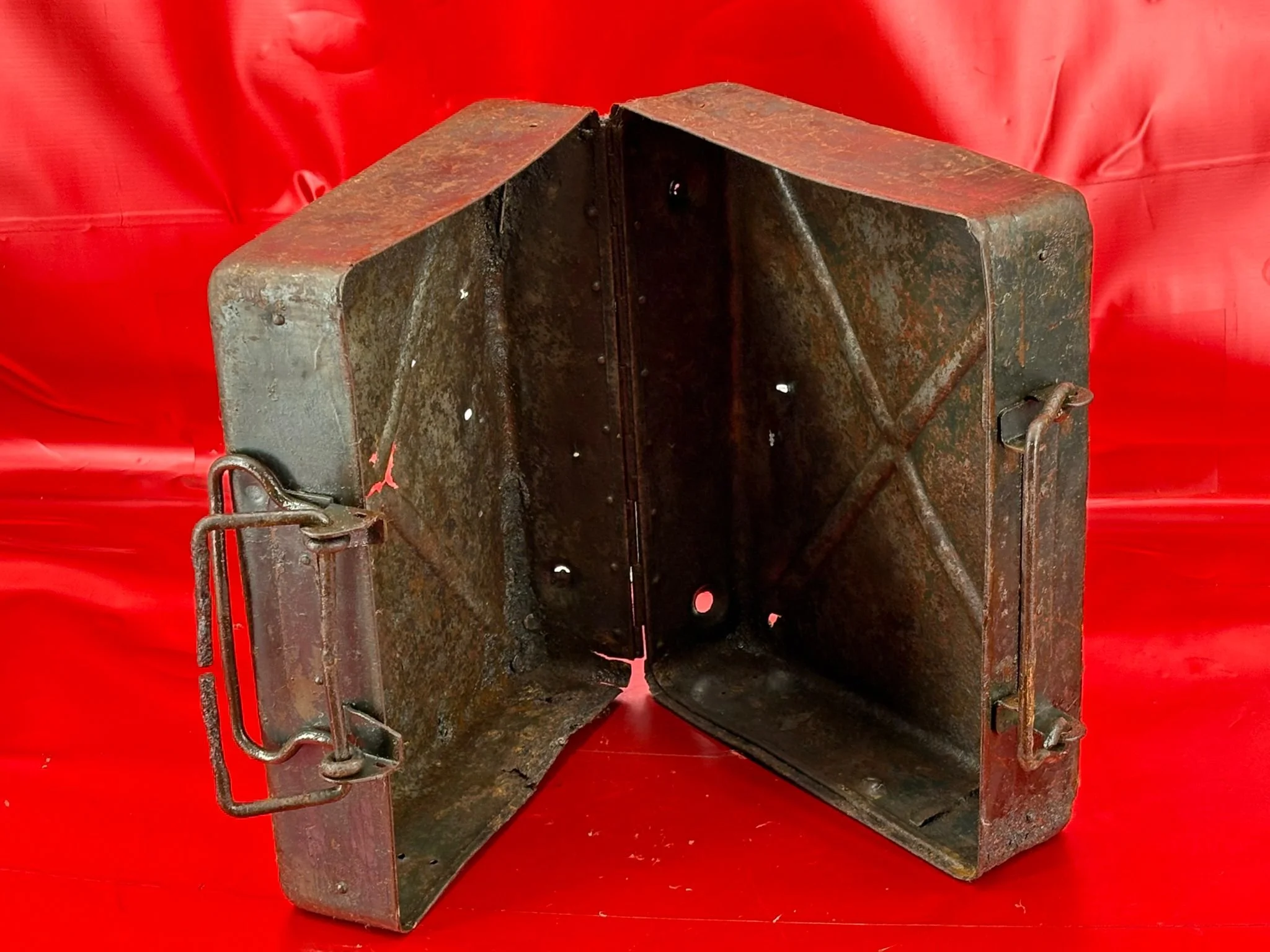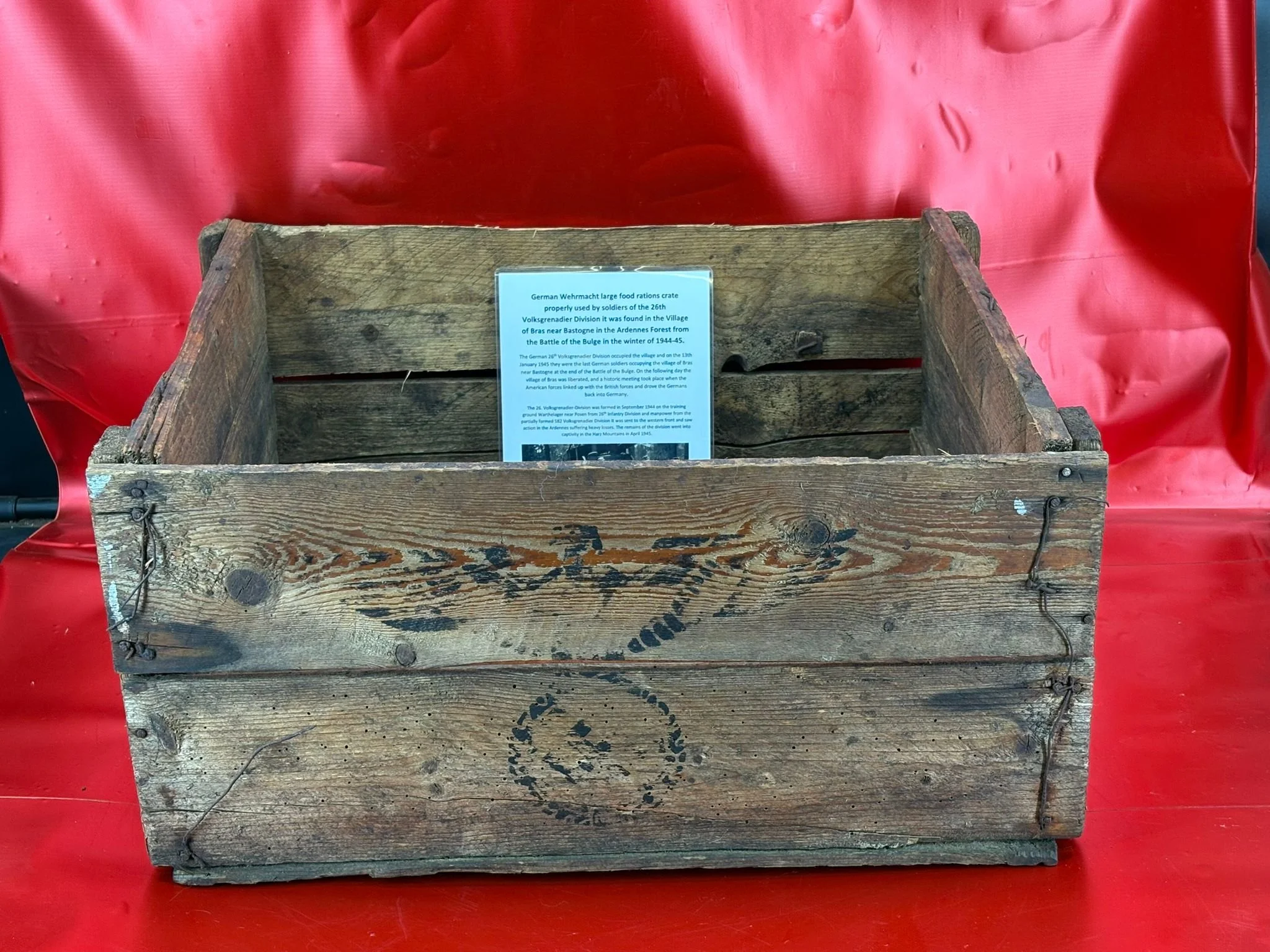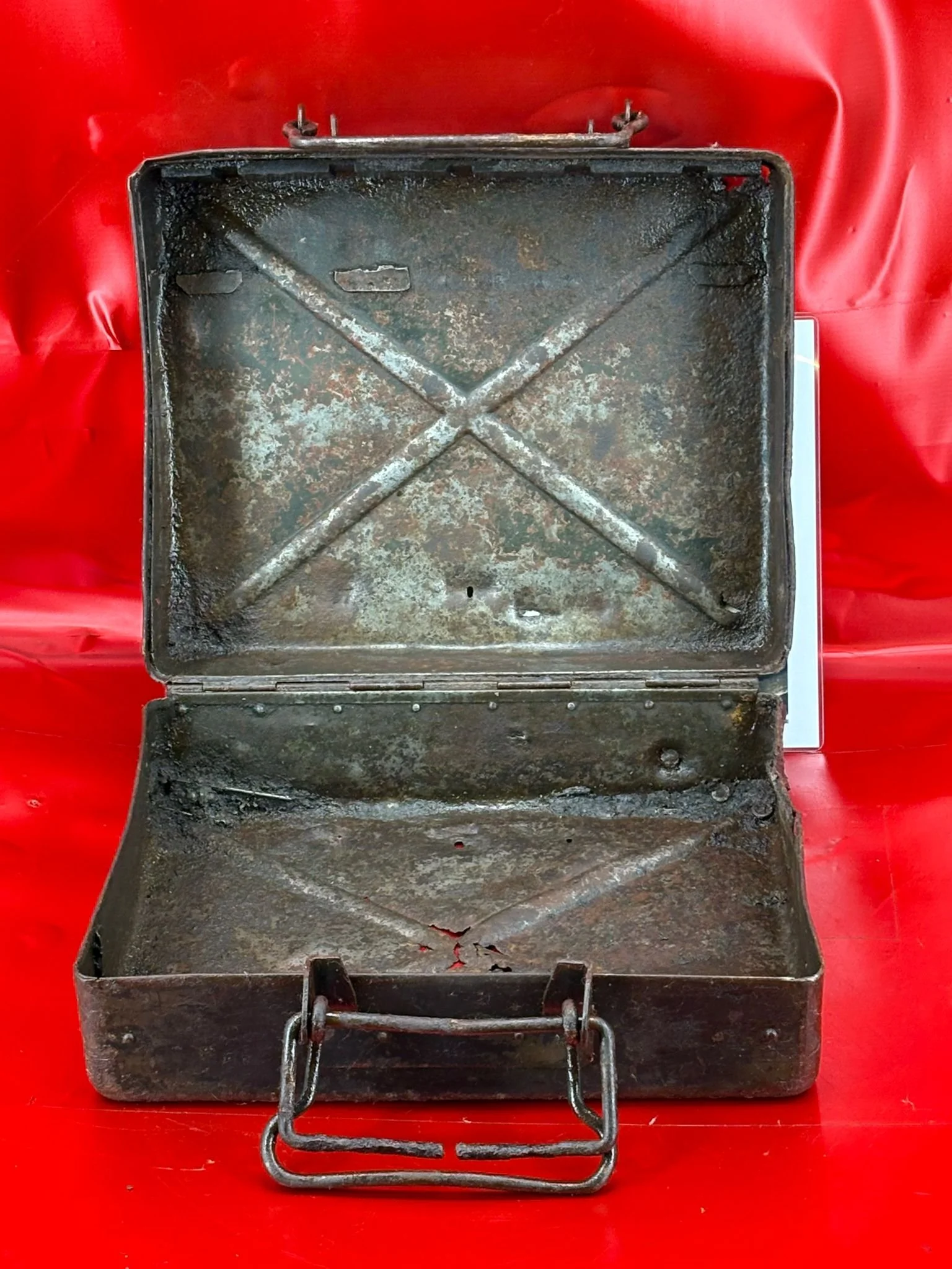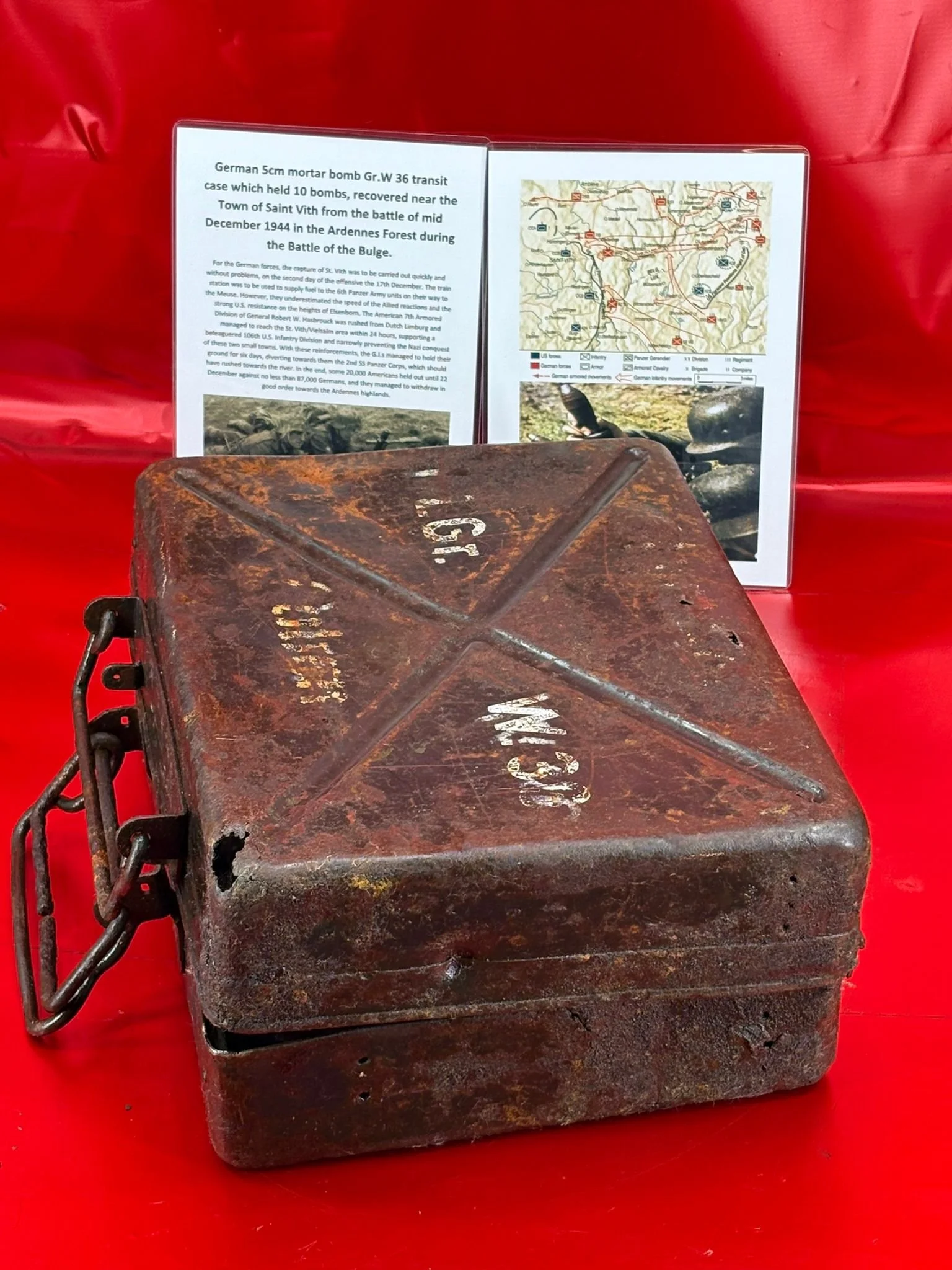 Categories: All WW2 Helmets, Badges, Belt Buckles, Medals, & Insignia WW2 Axis Aircraft Parts & Relics WW2 Allied Aircraft Parts & Relics WW2 Tank & Armoured Vehicle Parts Western Front WW2 Tank & Armoured Vehicle Parts Eastern Front WW2 Hand-Rifle Grenades, Mortar Bombs, Mines, Rockets WW2 Wooden & Metal Ammunition Crates, Boxes, & Tubes WW2 Artillery Shells, Fuses, Cases, & Projectiles WW2 Battlefield Relics West Front, Africa 1939-1943 WW2 Battlefield Relics Western Front 1944-1945 WW2 Battlefield Relics Eastern Front 1939-1945 WW1 Steel Helmets, Bayonets, Grenades, & Mortars WW2 Kriegsmarine Naval Relics, & Pacific Relics WW1 & WW2 Uniform Paperwork Pictures WW1 Allied British & French Relics WW1 Axis German & Austro Hungarian Relics WW1 Artillery Shells, Fuses, & Ammunition Crates & Boxes Gift Voucher All / WW2 Wooden & Metal Ammunition Crates, Boxes, & Tubes Russian 120mm mortar bomb tail section dated 1944 fired by the Russian 1st Guards Tank Army and recovered near the village of Sachsendorf on the Seelow Heights, 16-17 April 1945 £25.00 Only 1 available Russian maxim machine gun ammunition tin sed by soldiers of the 69th Army and recovered near the River Oder at Lebus, south of the Seelow Heights April 1945. £30.00 Only 1 available German complete 4 shell metal transport container dated 1941,maker marked for 5cm pak 38 gun recovered in 2022 from an old German ammunition bunker site in Narva 1944 battle. £40.00 Only 1 available German Army engineers carry case, maker marked dated 1936 recovered from the Kursk battlefield of 1943 £35.00 Only 1 available Battle damaged half a German 3.7cm flak shell carry case used by the 3.7cm flak anti-aircraft gun recovered from lake near Bastogne, Battle of the Bulge 1944 £30.00 Only 1 available Half a German 3.7cm flak shell carry case which has complete internal racking used by the 12th SS Panzer Division recovered 2007 from Krinkelt in the Ardennes Forest 1944 £25.00 Only 1 available German Naval 88mm flak gun shell container recovered from Kriegsmarine costal artillery position on the Atlantic wall at Saint Malo in France £30.00 Only 1 available German metal transport container for 76.2mm anti tank gun shell with rare 1942 pattern Dunkelgelb paintwork from SS ammunition store in Narva £35.00 Only 1 available Very rare German tellermine 42 anti-tank mine carry case lid, battle damaged solid relic condition recovered from near village of Trun in the Falaise Pocket, Normandy 1944 £28.00 Only 1 available German civilian made small medical box re used by the Wehrmacht recovered from the village of Bras near Bastogne from the Ardennes forest 1944-1945 £45.00 Only 1 available Nice condition German 12cm mortar charge container complete recovered near the village of Marinovka, an area defended by the German 297th Infantry Division at Stalingrad. £28.00 Only 1 available Russian maxim machine gun ammunition tin relic condition used by soldiers of the 69th Army and recovered near the River Oder at Lebus, Seelow Heights 1945. £38.00 Only 1 available Complete German 3.7cm flak shell carry case which has most of its internal racking used by the 12th SS Panzer Division and recovered in 2007 from the woods at Krinkelt in the Ardennes Forest £50.00 Only 1 available Fantastic condition semi-relic German 5cm mortar bomb Gr.W 36 transit case which recovered many years ago near the Town of Saint Vith in the Ardennes forest £75.00 Only 1 available German wooden carry crate for 2 x shell cases for 15cm SIG 33 heavy infantry gun, black ink markings recovered at Helmond in the Netherlands £38.00 Only 1 available American wooden ammunition crate for 81mm mortar rounds found in 1997 in the village of Le Gleize, Ardennes forest 1944 £40.00 Only 1 available German ammunition crate that held 1 case and 2 extra charges for 15cm Kanone with paper labels last packed 1942 recovered in the Demyansk Pocket in Russia 1941-1942 £35.00 Only 1 available Czechoslovakian wooden ammunition crate used by the German Army fired by VZ/1419 field gun it carried 3 rounds of ammunition found in Dieppe used in Normandy 1944 £165.00 Only 1 available German airtight wooden ammunition crate a Luftdichter patronenkasten taken from abandoned German vehicles in the village of Mont, just north of Houffalize. in the Ardennes Forest 1944-1945 £58.00 Only 1 available Rare to find German cardboard 15cm Nabelwerfer rocket round transport canister remains recovered from the battlefield at the Seelow Heights in 1945 £30.00 Only 1 available German Wehrmacht large food rations crate with eagle originally used by the 26th Volksgrenadier Division and was recovered from the village of Bras, near Bastogne, Ardennes Forest 1944-1945 £65.00 Only 1 available